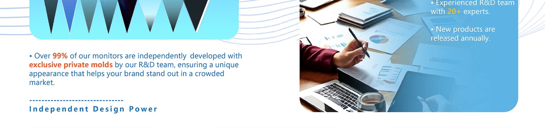 Наша команда НИОКР постоянно разрабатывает уникальные проекты и индивидуальные решения, включая игровые OLED-мониторы, мини-светодиодные дисплеи с расширенным динамическим диапазоном и передовую технологию защиты зрения с низким уровнем синего света при естественном освещении в сотрудничестве с ведущими учреждениями, такими как Чжэцзянский университет и производитель панелей, как Банк Англии. Это позволяет нам поставлять не только стандартную продукцию OEM/ODM, но и индивидуальные решения, отвечающие конкретным требованиям рынка.