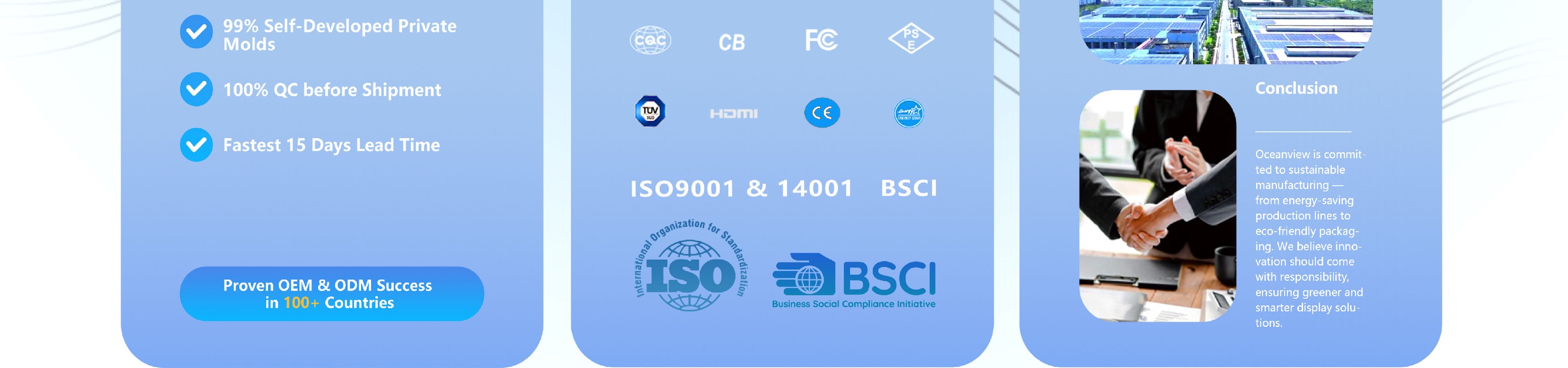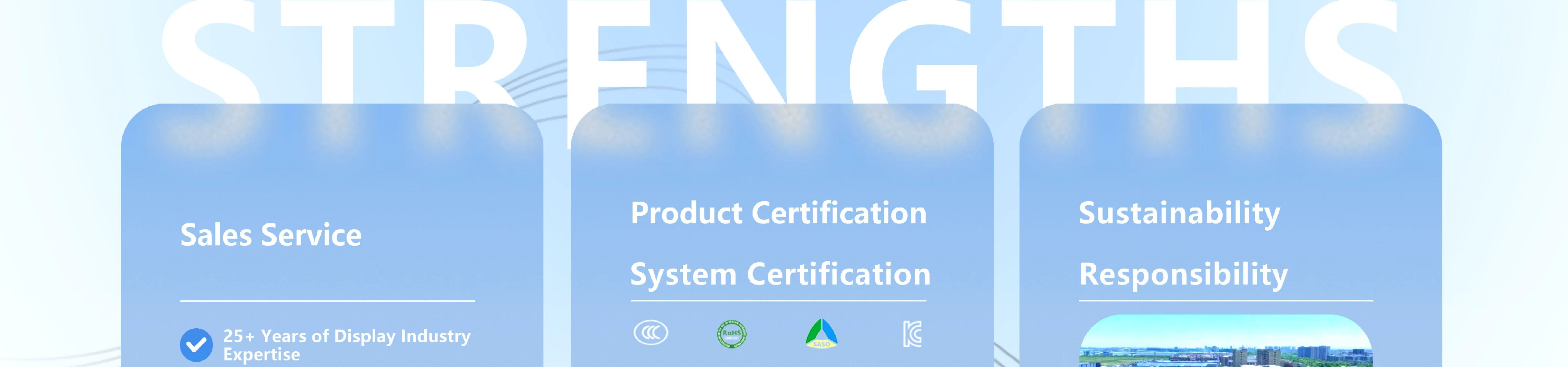 Мы закупаем панели у ведущих мировых поставщиков, включая AUO, BOE, CSOT, HKC и LG, что гарантирует стабильную производительность и стабильность поставок. Все наши продукты отличаются высоким разрешением (до 8K), высокой частотой обновления (до 600 Гц), широким цветовым охватом, а также технологией защиты зрения и снижения уровня синего света. Чтобы гарантировать соответствие международным стандартам, наш завод сертифицирован ИСО 9001:2015, ИСО 14001:2015, BSCI, а наша продукция сертифицированаCE, CB, RoHS, FCC, KC, KCC, Energy Star и т. д.
